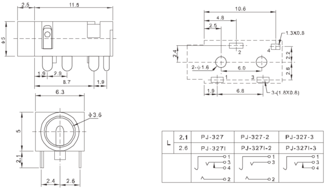 Popis z tohoPJ-327 3,5mm Audio zásuvka 4pinový pravoúhlý typ DIP3,5mm audio zásuvka 4pinový typ DIP, jmenovité DC 30V 0,5A, životnost 5000 cyklů