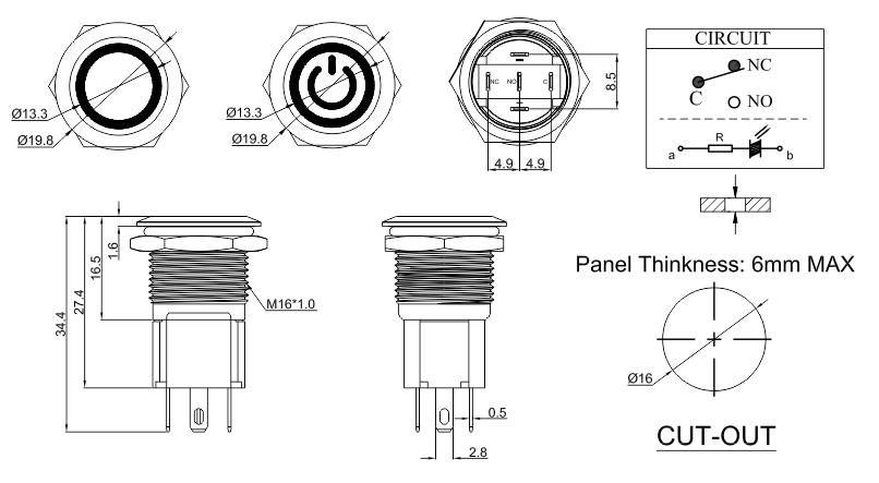Descripción de estaPBM16 13Z F PR2 A6 Interruptor de botón de metal SPST OD16mm bloqueo sin LEDPBM16-13Z-F-PR2-A6 Interruptor de botón de metal SPST, bloqueo de OD16 mm con (fuera) LED, 200,000 ciclos de vida útil