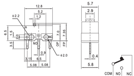 LeírásebbőlMikrokapcsoló kar nélkül DM1-00PMikrokapcsoló, egerekhez/egyéb eszközökhöz használható, 0,1A 12V DC/1A 125V AC/3A 250V AC minősítés, 1 000 000 ~ 3 000 000 ciklus élettartamaParaméterebbőlMikrokapcsoló kar nélkül DM1-00P