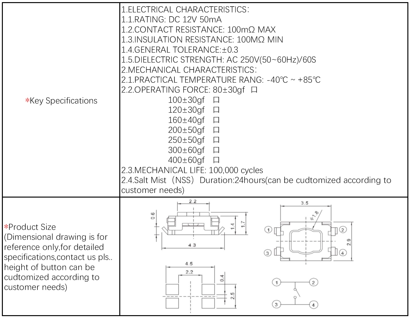 설명 이의ecigarette를 위한 4개의 맨끝을 가진 TS 1185M 작은 촉각 스위치 직각 SMT 유형TS-1185M 3.0*3.5*1.85 e-cigarette,DC 12V 0.05A, 100,000 사이클 작동 수명 테스트를 위한 4개의 단자가 있는 소형 촉각 스위치 직각 SMT 유형.