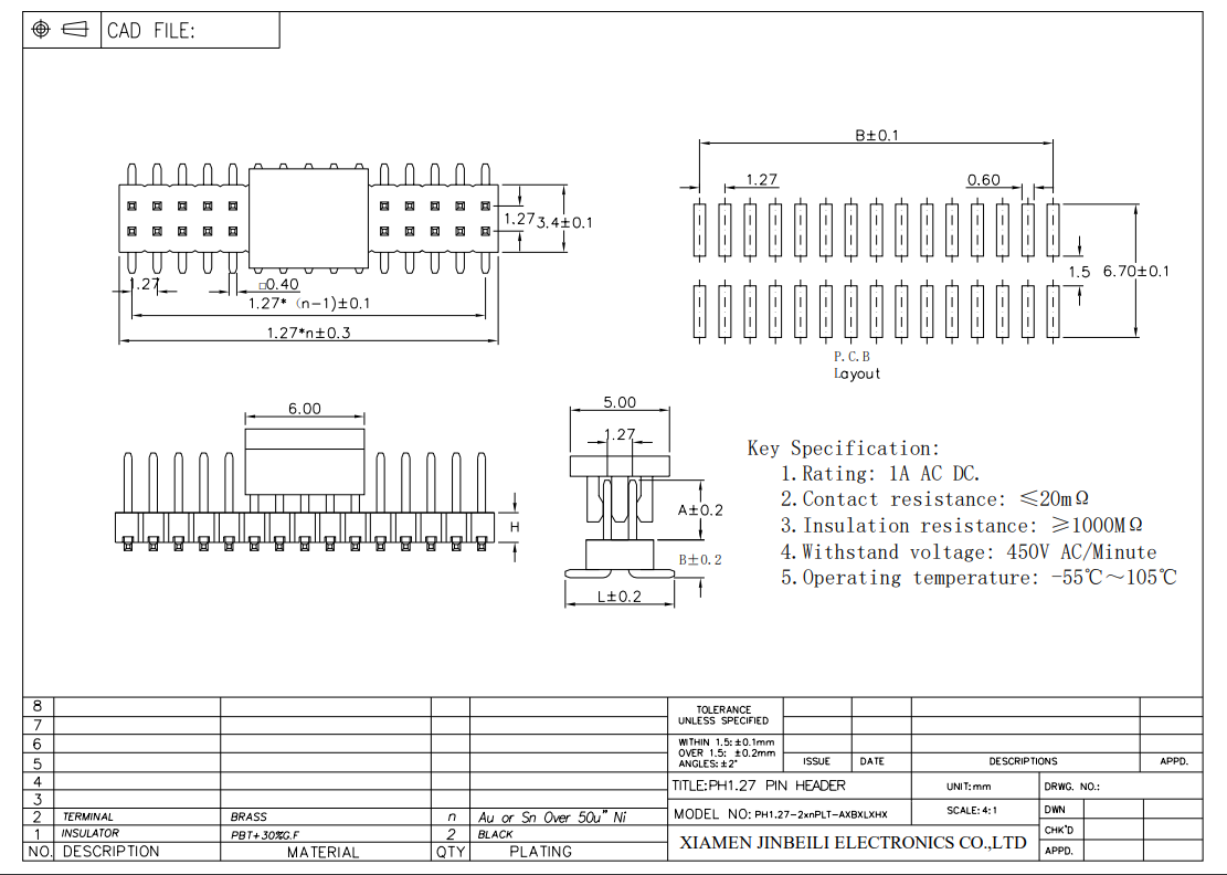 PH1.27 PIN HEADER DOUBLE ROWS VERTICA SMT