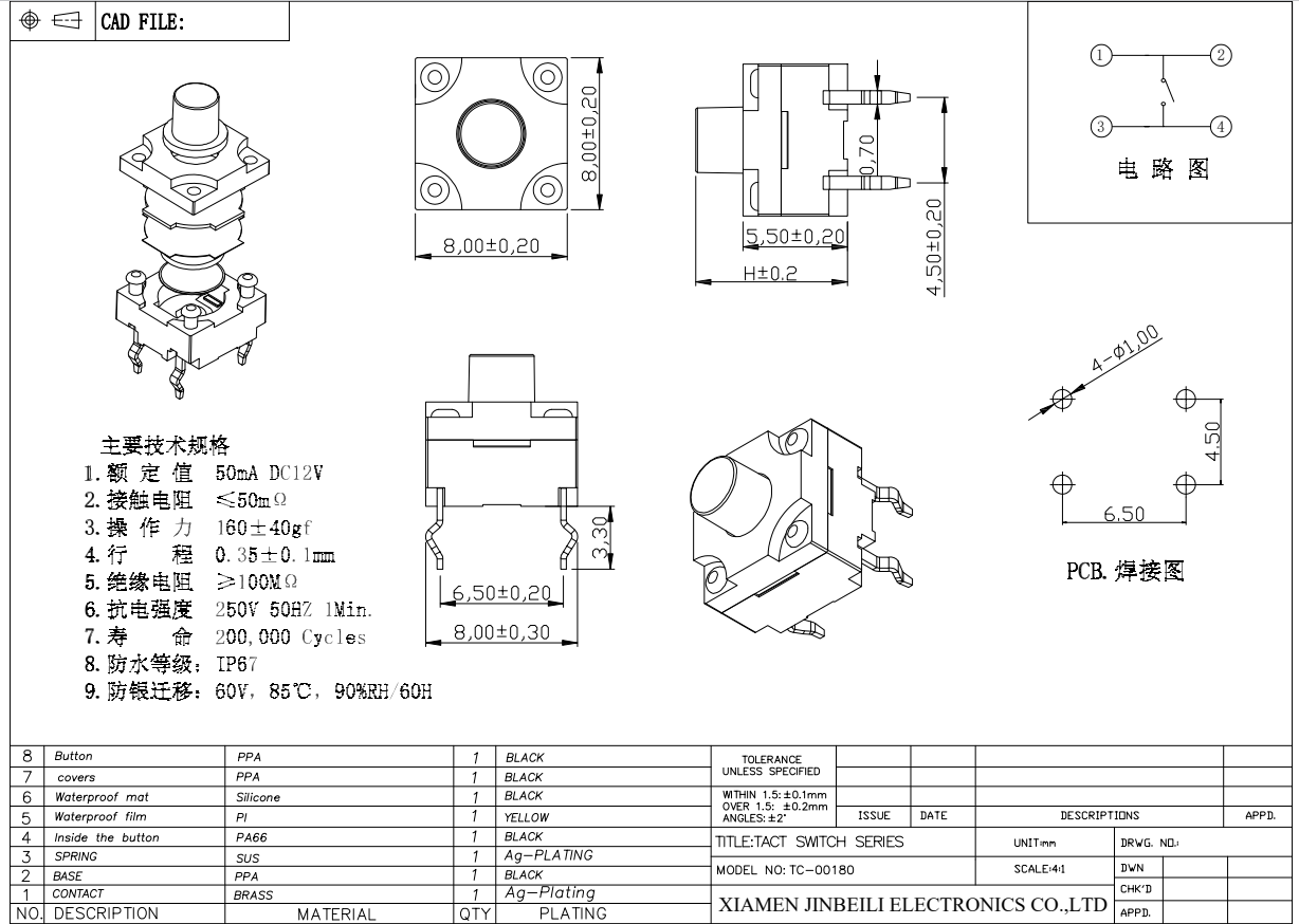 TC-00180 8*8mm IP67 Tactile Switch Through Hole