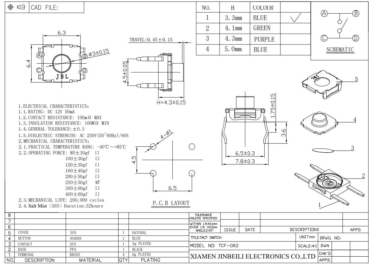 TC-00120 12*12mm IP67 Tactile Switch 4Pin Through Hole
