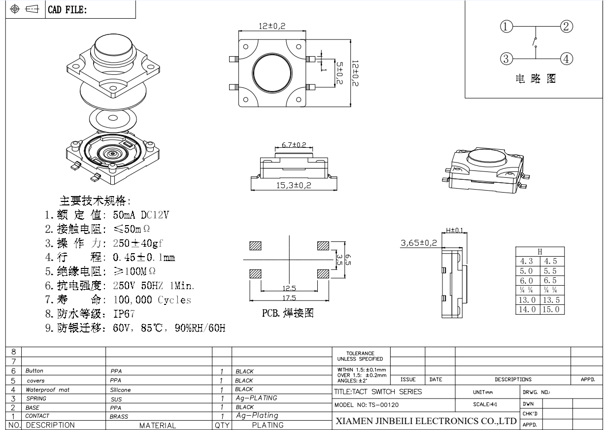 TC-00120 12*12mm IP67 Tactile Switch 4Pin Through Hole