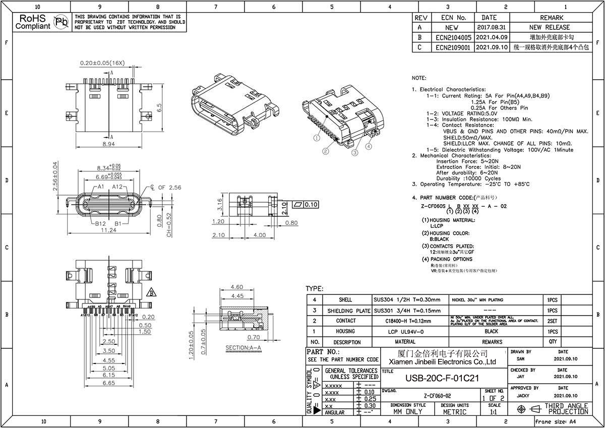 USB-20C-F-02D01 USB 2.0 Type C Jack 14 Pin Thro...