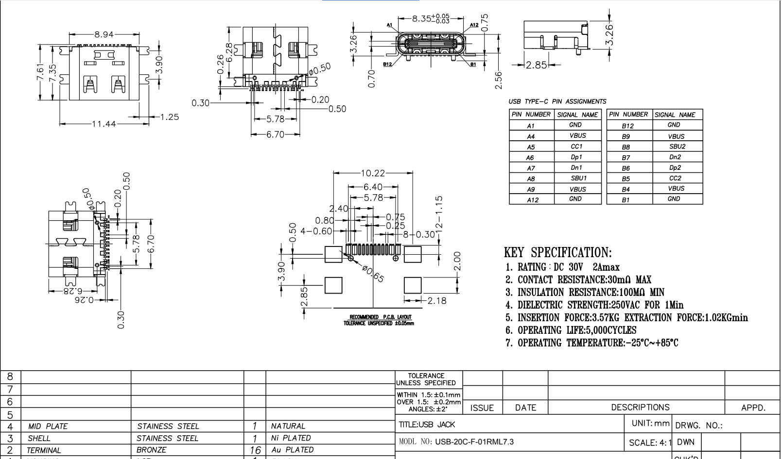 USB-20C-F-01RML7.3 USB Type C Jack 16 Pin SMT