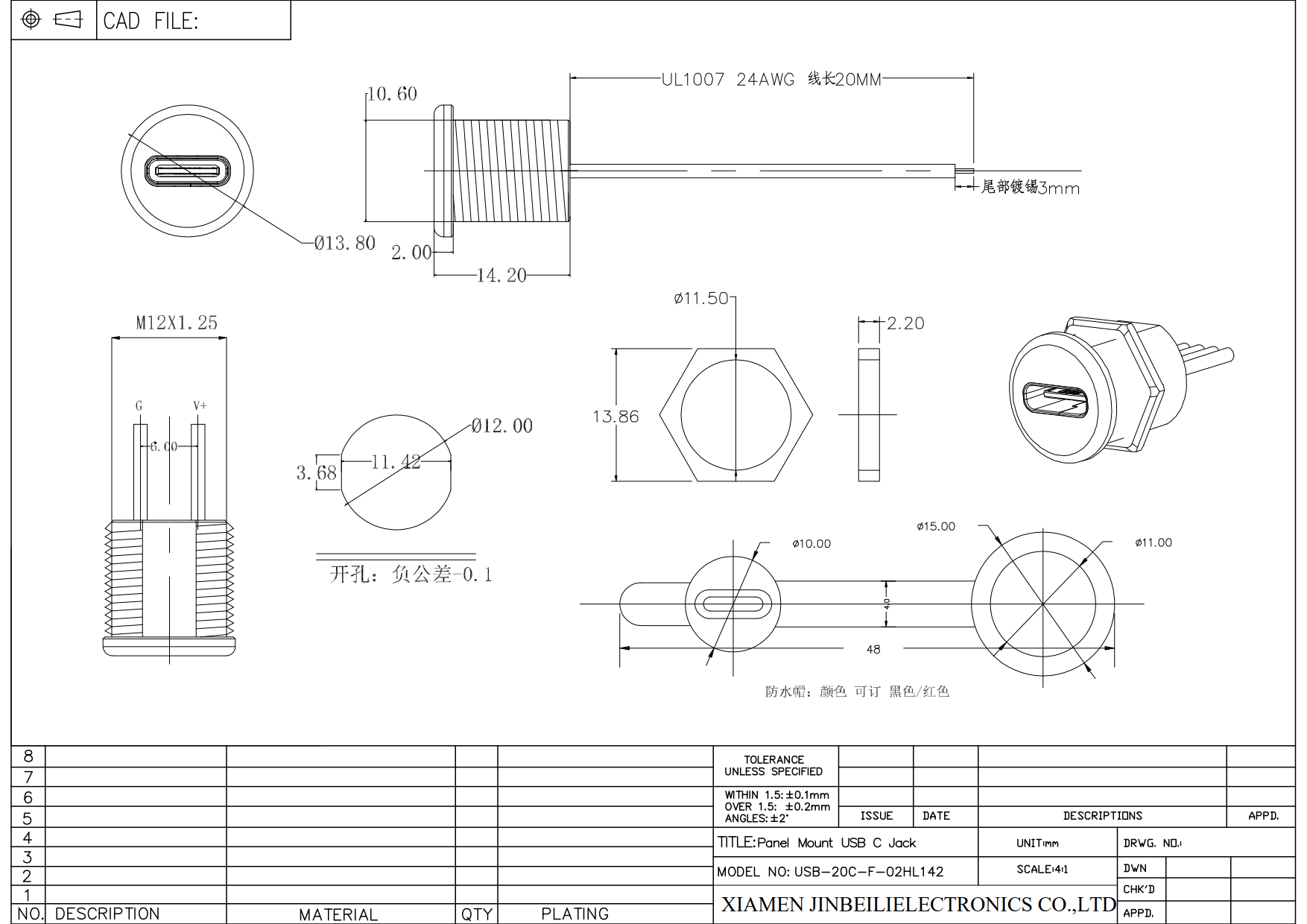 USB-20C-F-02HL142 Type C with wires 2pin 3pin 4pin JST connector withNut and waterproof rubber ring