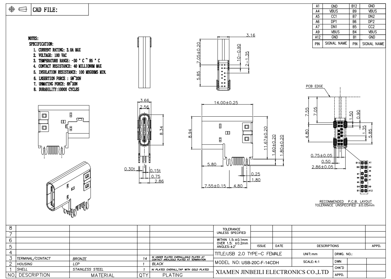 USB-20C-F-14CD Upright USB Type C Socket 14Pin