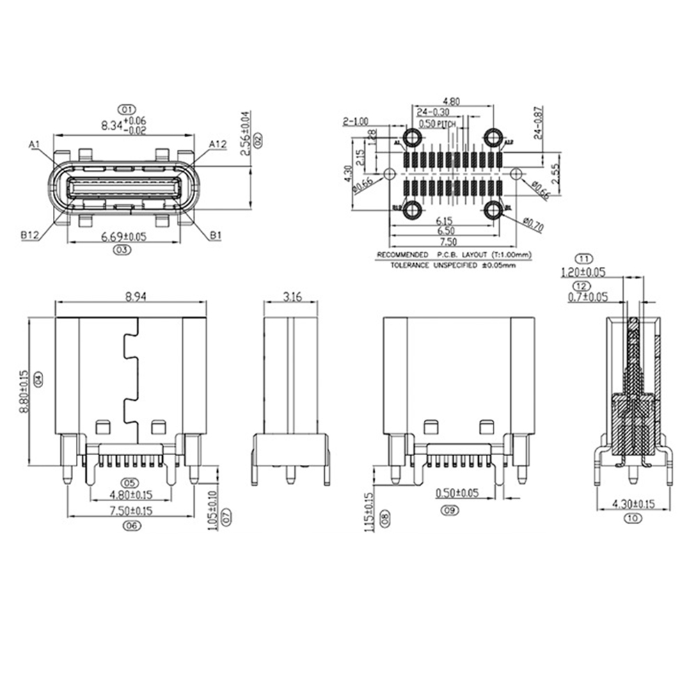 USB-31C-F-01A Mid Mount USB 3.1 Type C Jack Socket 24P SMT