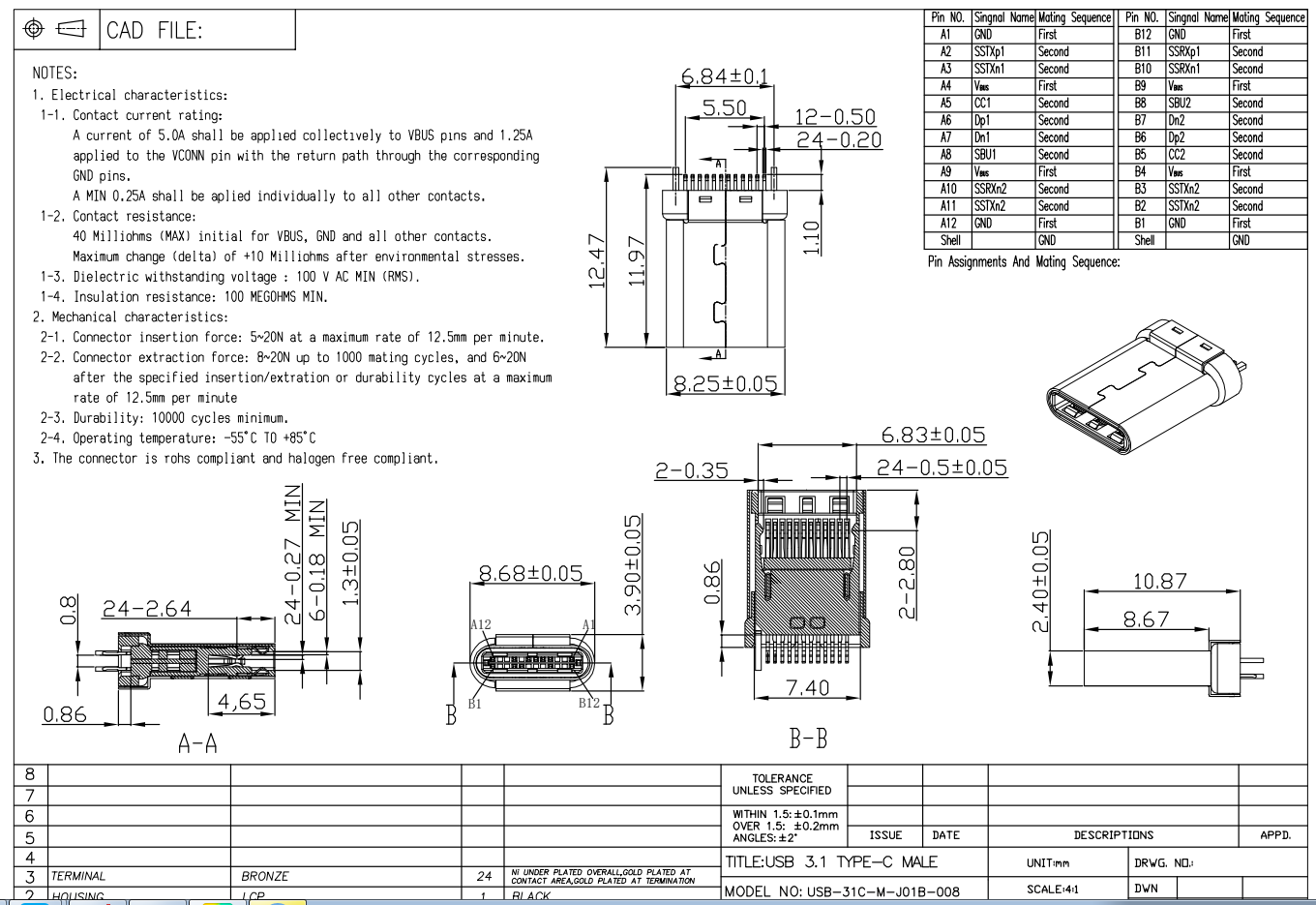 USB-31C-M-J01B-008 Edge Mount USB Type C Plug 24P