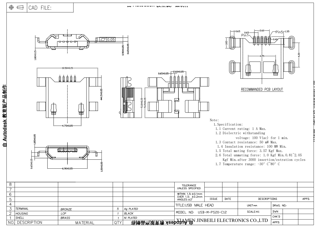 USB-M-RS10 Micro USB 2.0 Jack SMT Through Hole