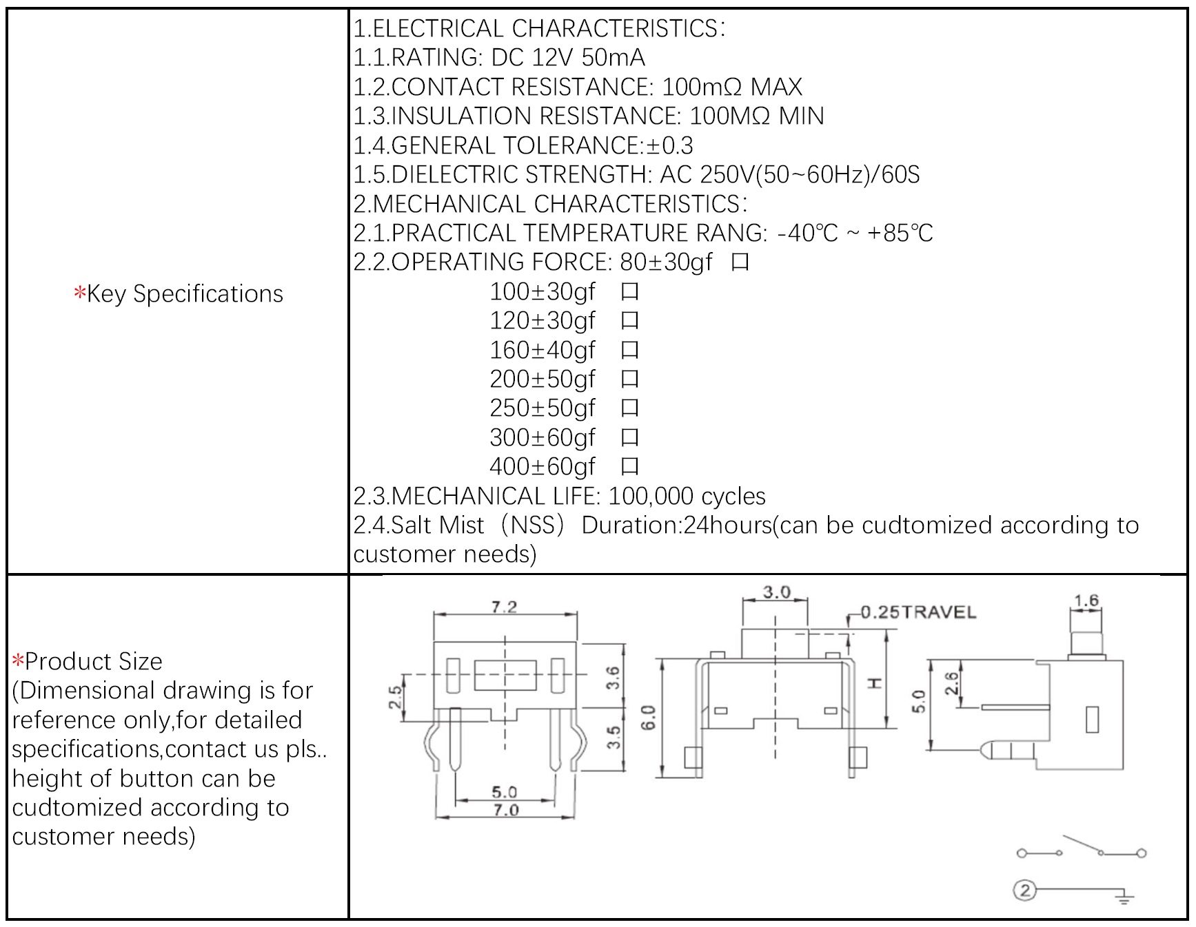 Parametre bununTC-00305 dokunsal anahtar Dokunsal Mikro Anahtar