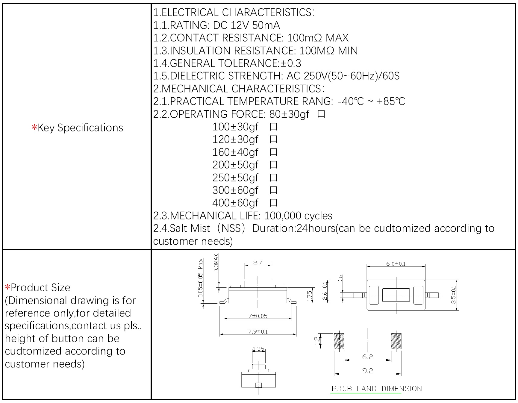 Tanım bununTS 1107E 2 terminalli dik açılı SMT tipi dokunsal seyahat anahtarıTS-1107 3.5*6*2.6 seyahat dokunma anahtarı dik açılı SMT tipi 2 terminalli, DC 12V 0.05A, 100.000 döngü çalışma ömrü testi.