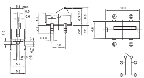 | *主要规格 | 1. 额定电流:0.1A MAX 2.额定电压:DC 12V 3.接触电阻:100mΩMax 4、绝缘电阻:100MΩMin 5、介电强度:AC 100V 1min 6. 操作力:中推:35gf~55gf 7. 使用寿命:100,000 次循环 8、盐雾试验:NSS 24H(可根据客户要求定制) 9、工作温度:-20°C~+70°C |